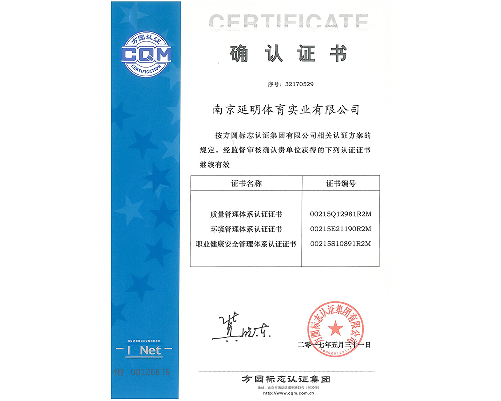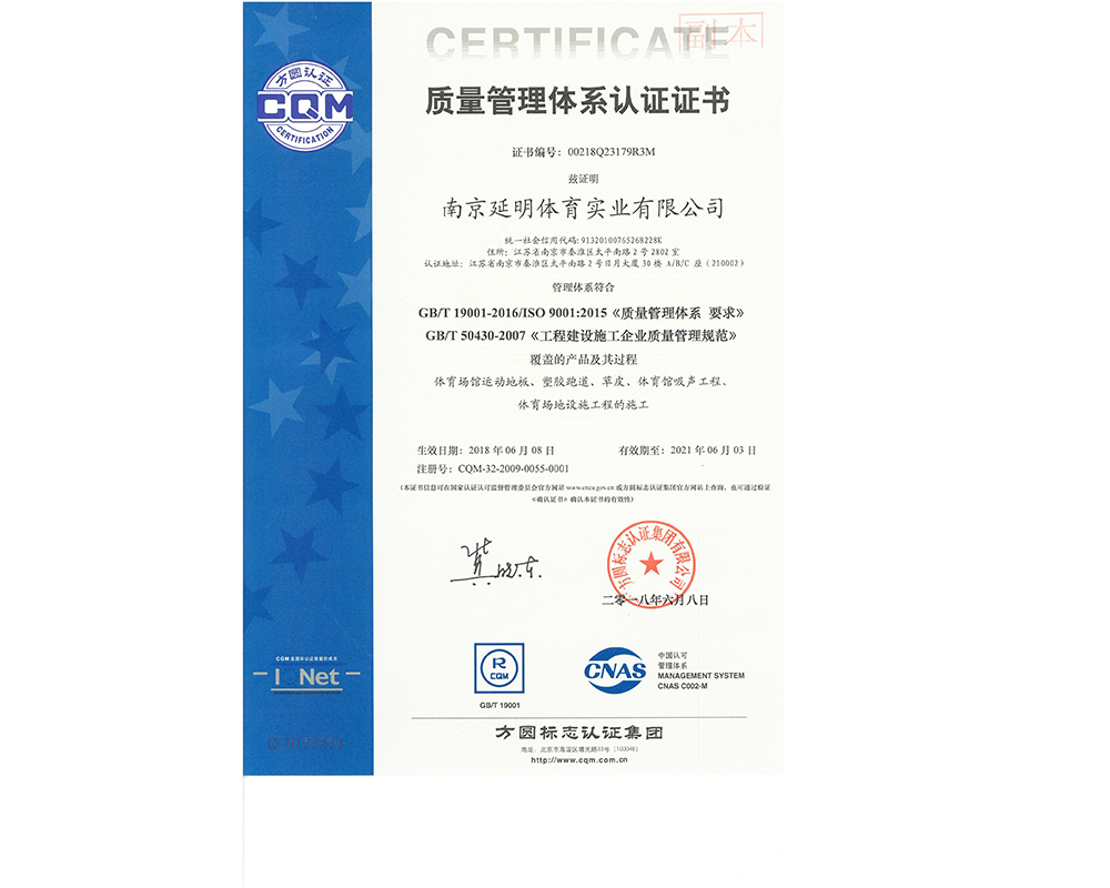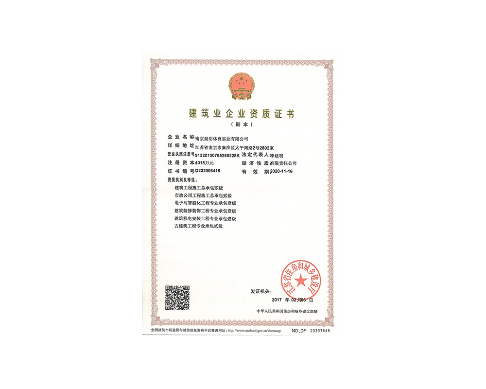 作為江蘇省體育產(chǎn)業(yè)示范單位,延明體育擁有多年相關(guān)工程總承包施工經(jīng)驗(yàn),取得建筑工程施工總承包二級(jí)、古建筑工程專(zhuān)業(yè)承包二級(jí)、建筑裝修裝飾工程專(zhuān)業(yè)承包一級(jí)、電子與智能化工程專(zhuān)業(yè)承包一級(jí)、市政公用工程施工總承包二級(jí)資質(zhì);通過(guò)ISO 9001:2015質(zhì)量管理體系認(rèn)證;通過(guò)ISO14001:2015環(huán)境管理體系認(rèn)證;通過(guò)IOS45001:2018職業(yè)健康安全管理體系認(rèn)證。